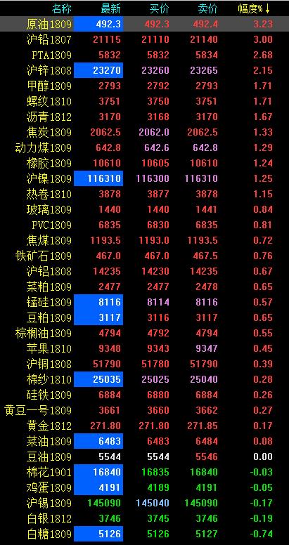 国内期货市场开盘,商品多数上涨,原油期货主力开盘涨超3%,PTA、沪锌涨超2%,螺纹、沥青、郑醇、沪铅、郑煤、橡胶、热卷、焦炭、沪镍、豆二涨超1%。