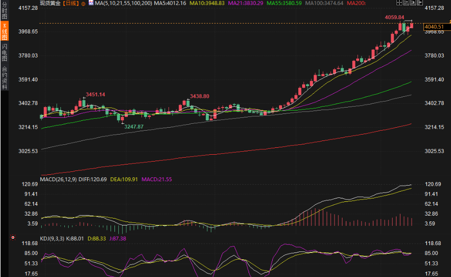 周一(10月13日)亚洲时段,现货黄金再度上演强势突破行情,盘中最高触及 4059.87 美元/盎司,刷新历史纪录。