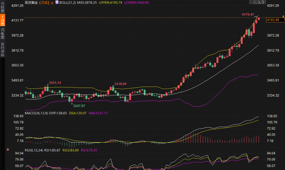 现货黄金周三亚市早盘再度强势拉升,一度飙升至4179.47美元/盎司的历史新高,尽管盘中短暂回调至4100下方,但买盘迅速涌入,将价格重新推上高位。截至收盘,金价上涨0.77%,报4142.01美元/盎司。